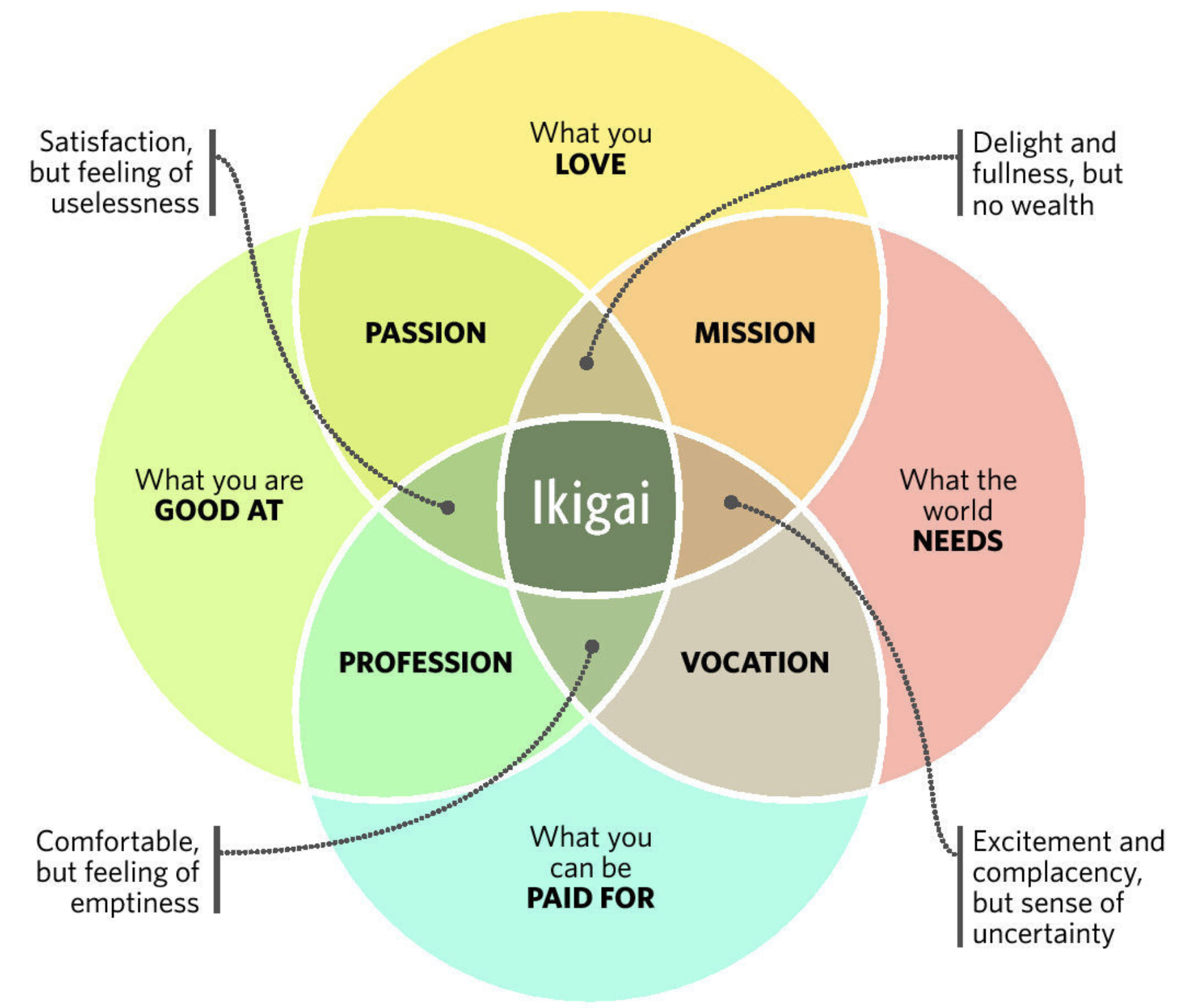 Admittedly, I did not consciously chart a course for myself (I know how unsexy that sounds). I got incredibly lucky to be in work environments where I was supported and challenged to grow and evolve continuously. However, looking forward, I am being more deliberate about what I want to do. Precisely, I am trying to find my ikigai. But what is ikigai, you ask?